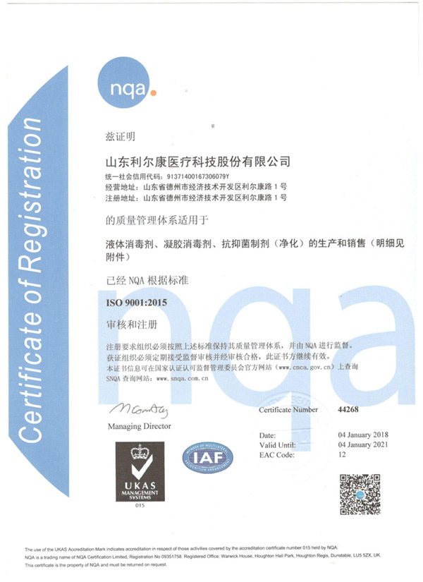 德州利爾康消毒劑9000認證之ISO9